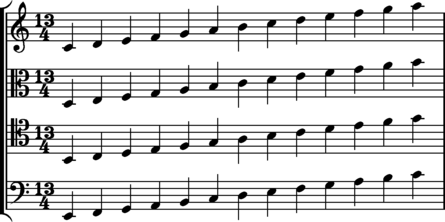 \ == stem down The basic algorithm for adding stems onto single notes when no beams are present: In order to determine the location of a note on a staff, the clef must be known. For example, G4 is on the second line from the bottom of the staff when a treble clef is being used, but when an alto clef is being used, the G4 pitch is on the top line of the staff. Here is an example of stem directions being added to notes in various clefs. Note that the input to the program does not require valid rhythmic syntax in the **kern spines. For example, the following data contains no rhythms: