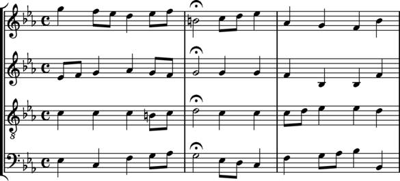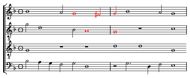 Module pitchesThe --pitches option can be used to display the underlying pitch grid used to calculate counterpoint modules. Here is some sample music to extract a pitch grid from: