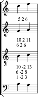 A counterpoint module consists of four notes as illustrated in the first measure of the musical example given below. A module contains two harmonic intervals (marked in blue) and two melodic intervals (marked in red) as highlighted in the second measure. Since any three of these intervals can be used to calculate the fourth, one of the intervals can be omitted from the description of the module without loss of information (as long as none of the four notes in the module are rests). Thus the number triple (10 -2 12) can serve as a compact description of the counterpoint module given in the following example: