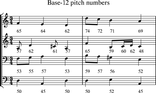Essentially, representing pitches in base-12 is equivalent to stripping off the accidental information of base-40 diatonic values. Or another way of stating this is that you can unambiguously map base-40 values to base-12 values, but not the other way around. Here is the same example segment of music, with pitches given base-12 numbers: