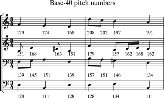 Base-40Base-40 is a method of encoding diatonic pitches with accidentals up to double sharps or flats. The base-40 chroma for pitches can be built up from the property that a minor second is a difference of 5 between pitch numbers in the base-40 system, and major seconds are a difference of 6. The C chroma value is set to the value 2 rather than 0 so that the octave values for C♭ and C♭♭ remain in the same octave as C♮ just above these pitches when using division by the base to extract the octave number. Here is a complete table of the base-40 chroma, using C=2 as the reference:
