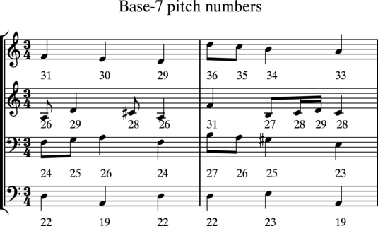 Here is the same example segment of music, with pitches given base-7 numbers: