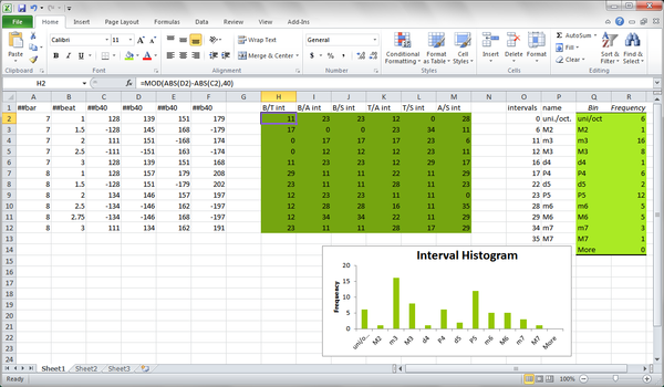 Using data in MS ExcelThe output from notearray can be loaded into MS Excel as a tab-deliminated text file (either the default matlab-style output, or the Humdrum output generated by the -H option). In addition, the output data can be copy/pasted from text editors/word processors which preserve tab charcters, such as the following textarea box on this HTML page:Below is a screenshot of the above data loaded into an MS Excel spreadsheet (xlsx, xls). The intervals between each voice are shown in the dark green box in the middle, with a histogram calculated in the light green box on the right which is plotted underneath. Note that the hightlighed cell (H2) contains the equation "=MOD(ABS(D2))-ABS(C2),40)" which is the interval between the tenor and bass voices (collapsed to less than an octave). Columns O and P contain a mapping of the interval value to a more musical name for the interval, with 11 being a minor third (m3). Click on the image for a larger view.