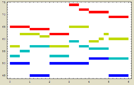 An example application of this data would be to load into Mathematica, and then generate piano-roll notation from the data with the following function: which generates this plot, with pitch on the y-axis and score duration (in quarter notes) on the x-axis: ![]() SetDirectory["C:/wherever"]; variable = Import["file.dat", "TSV"];When multiple input files are processed by notearray, the Mathematica-formatted output will contain a nested list of data for each input file. Position information columnsFive types of positional information can be given on the left side of the note array. By default the first two columns of data for each row in the array are the measure number and the starting beat position of the sonority within the measure. These columns can be suppressed with the -M and -B options, respectively. Use both options to suppress both columns of information, or use the -N option to suppress both columns of positional information, so that only note columns are output: